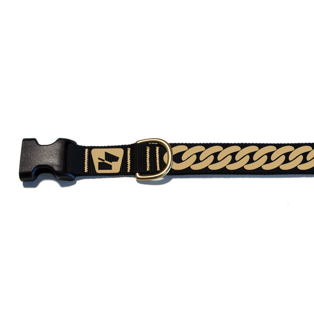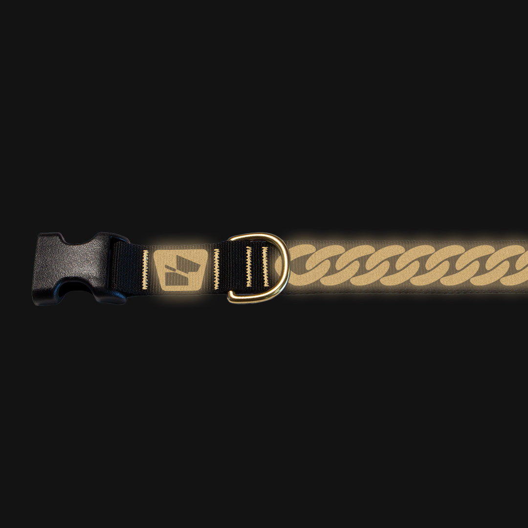 Your pup's about to look like a million bucks with our 24k Gold Curb Chain collar. This luxe design combines street style with serious safety – the reflective curb chain pattern creates mesmerizing movement that drivers can't miss. It's bling that actually works, turning heads while keeping your dog visible during dawn and dusk adventures. Built with the same technical specs as all our Base Camp collars: mil-spec CORDURA® webbing, solid brass hardware, and double-stitched construction that's ready for anything from city sidewalks to mountain trails.