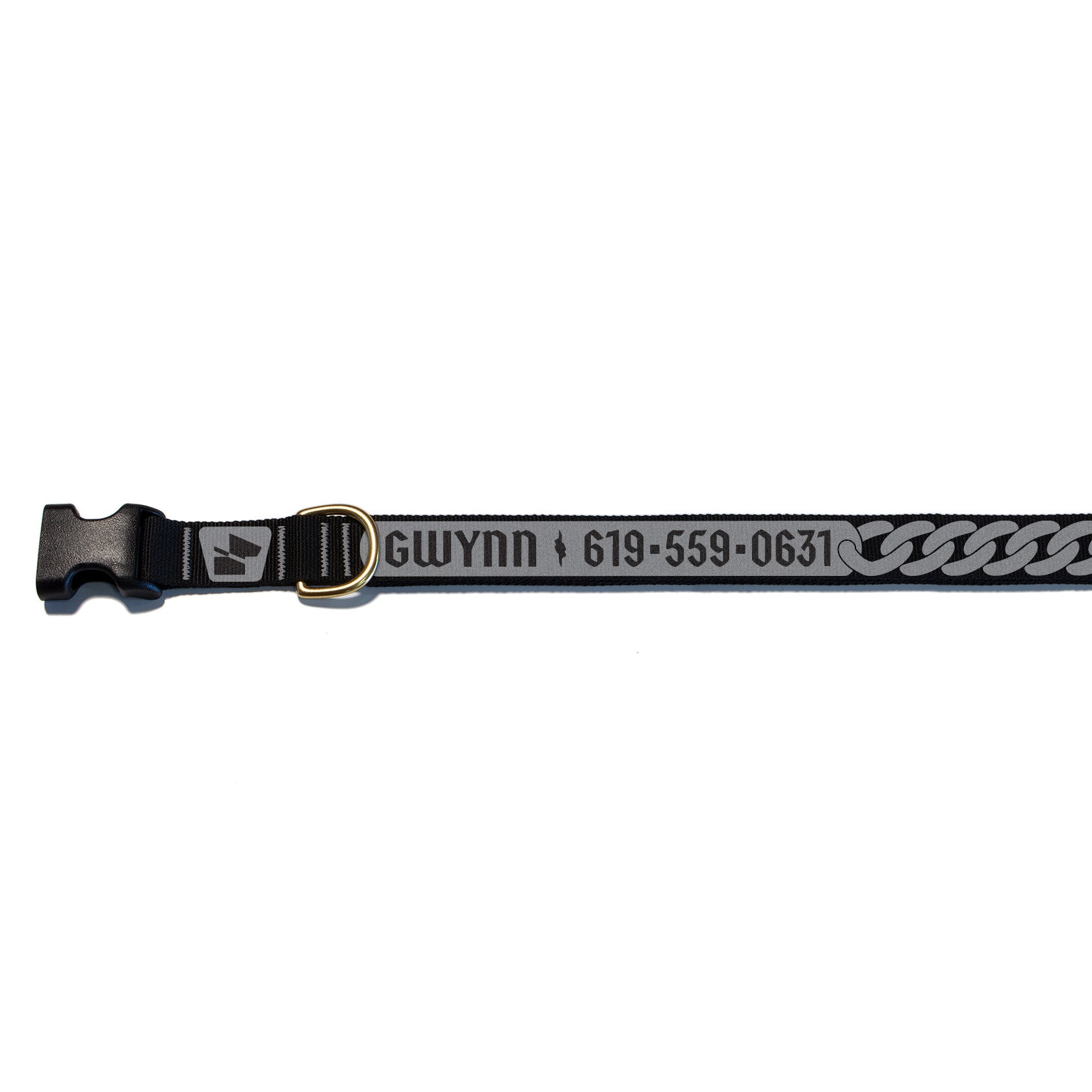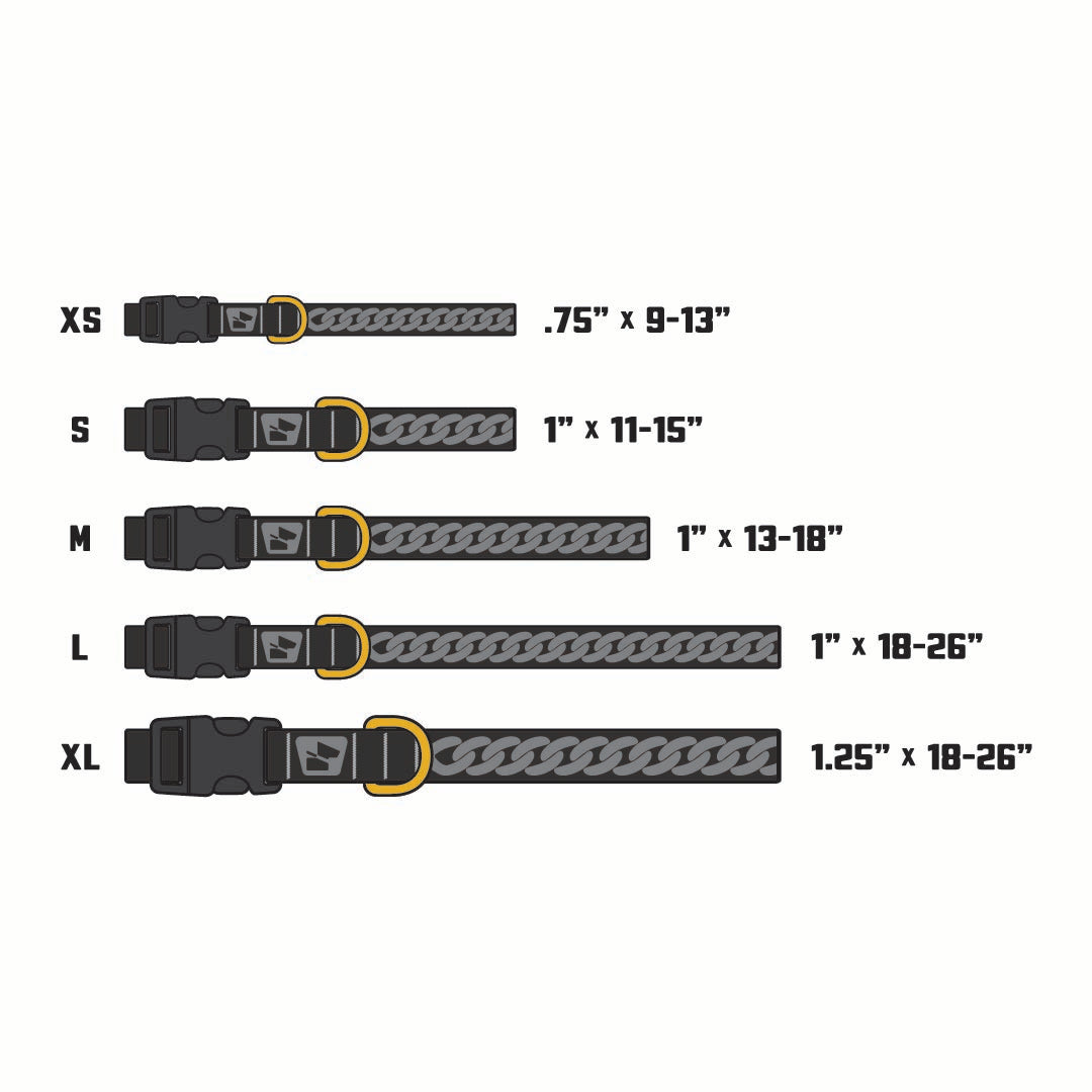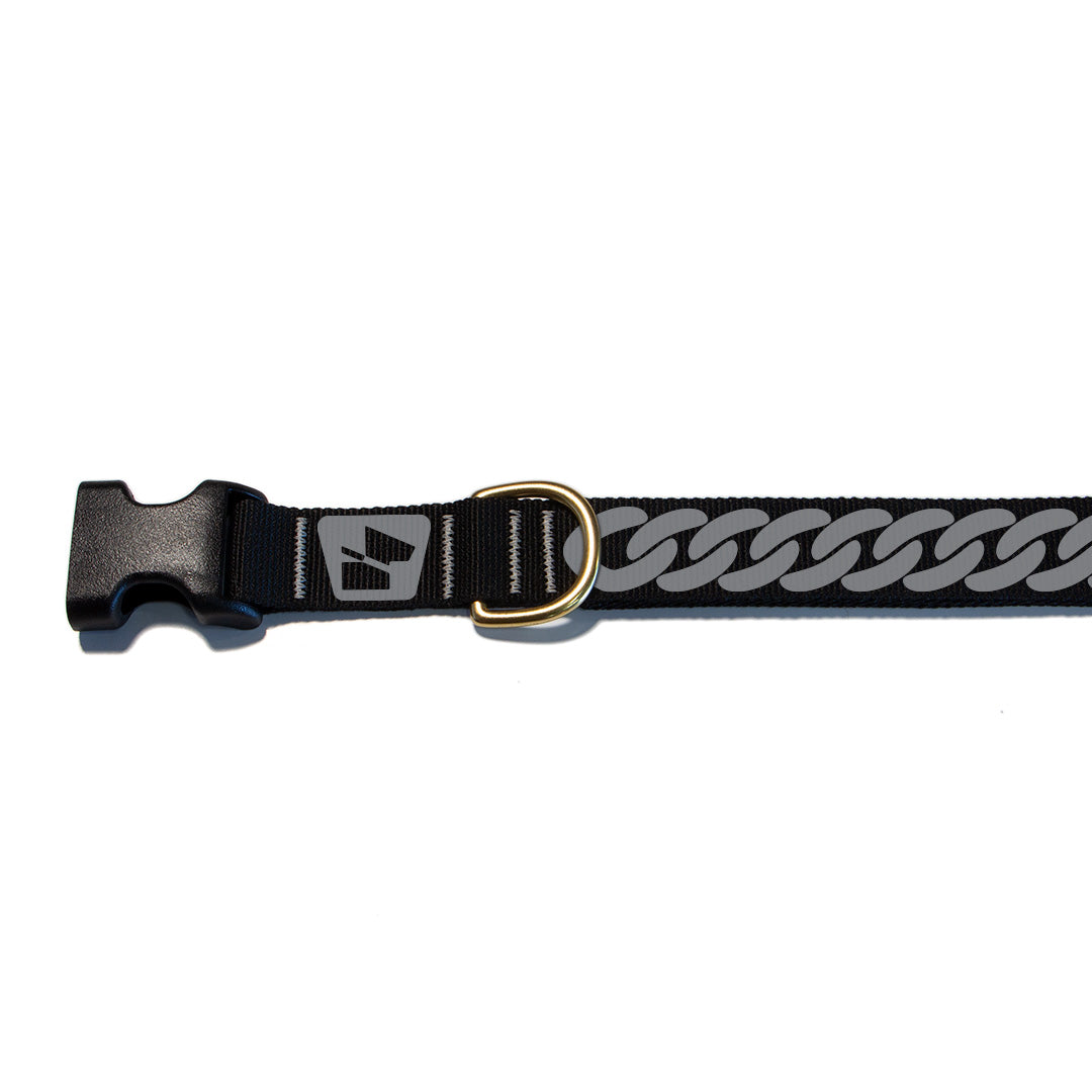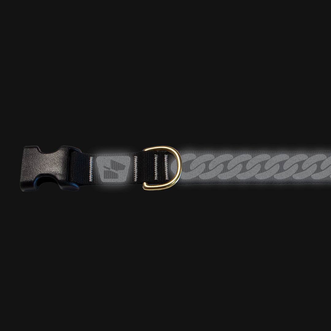 Sleek, sophisticated, and seriously visible – our Pure Platinum Curb Chain collar brings high-end style to high-performance safety. The reflective curb chain pattern catches light from every angle, creating dynamic visibility that outperforms basic reflective strips. Whether you're navigating busy city streets or exploring twilight trails, this collar's technical construction handles it all. Mil-spec CORDURA® webbing, solid brass hardware, and precision double-stitched bar-tacks deliver the durability your adventures demand, while the DuraFlex® Weinerlock buckle keeps everything secure.