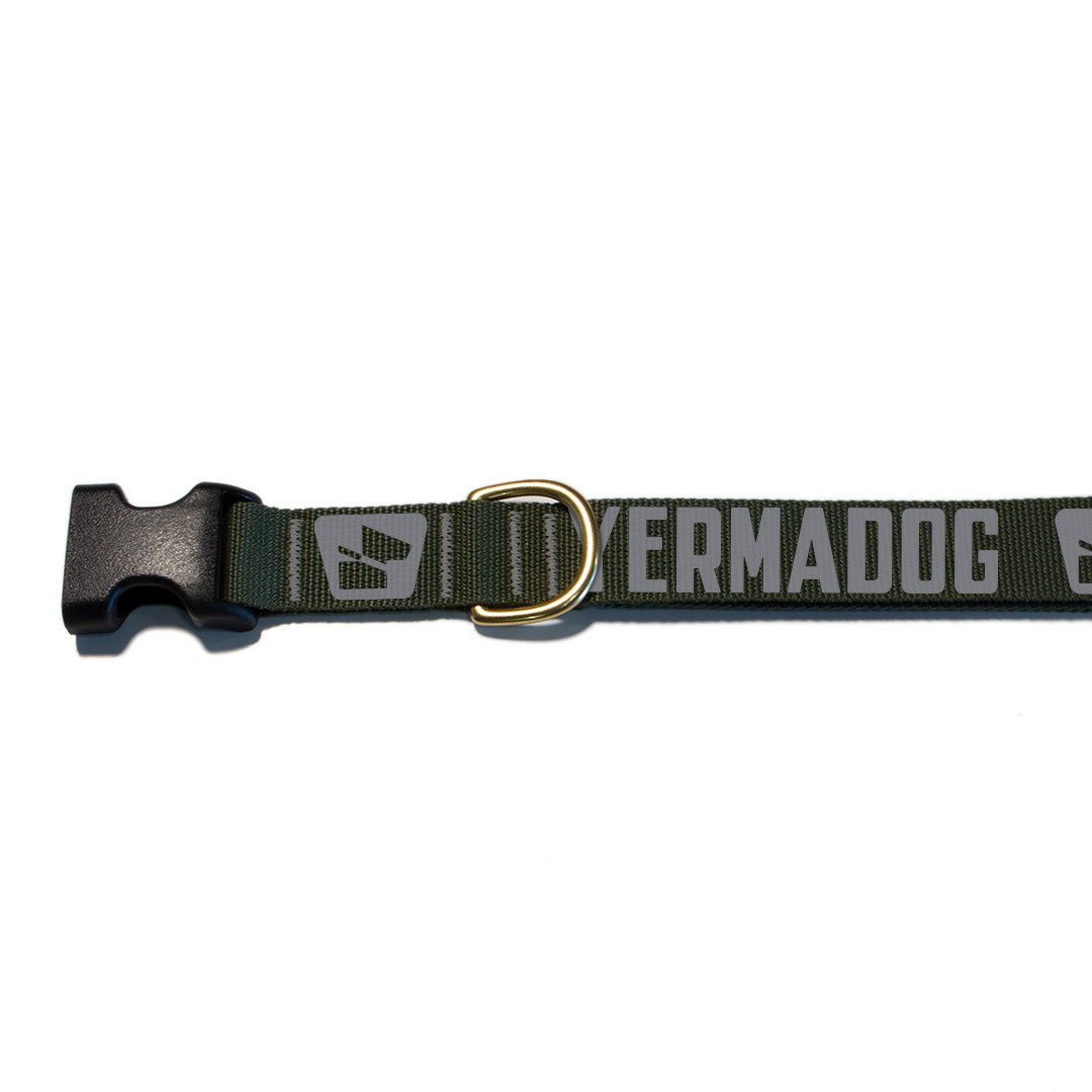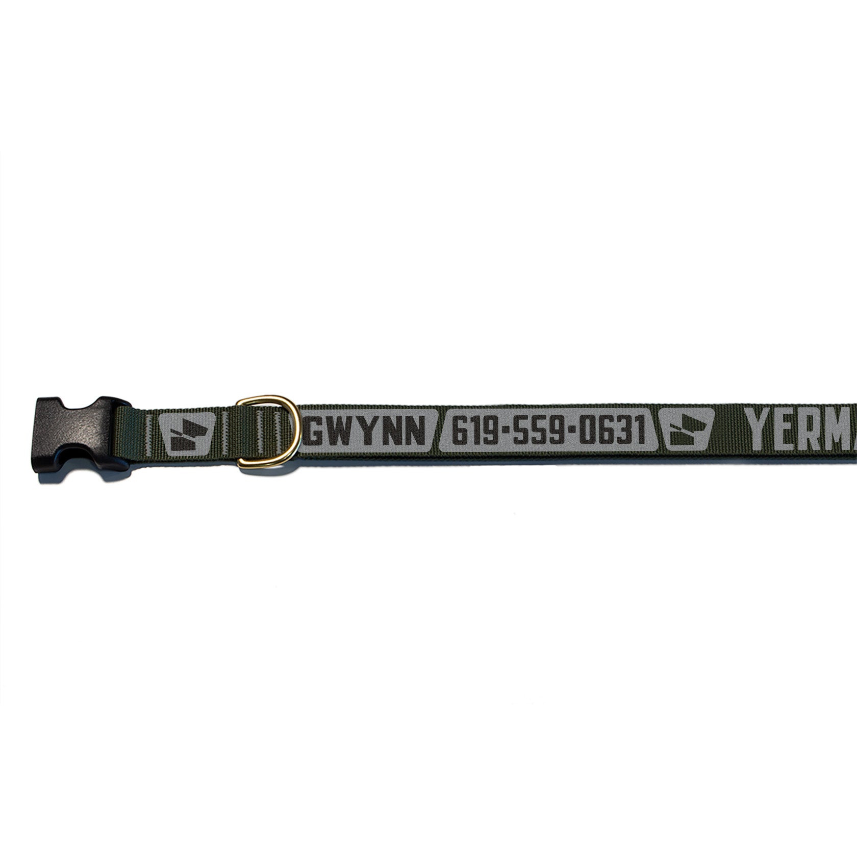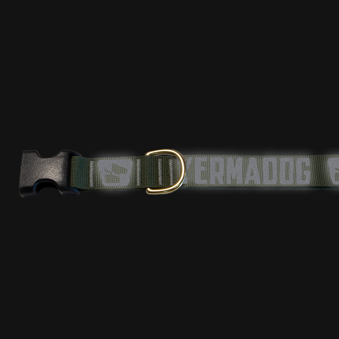 Forest-ready and street-smart, our Ranger Green Loud Logo collar brings tactical style with unmistakable visibility. The bold reflective graphics pop against the rich green base, creating high-contrast visibility that works in any environment. Whether you're navigating urban trails or backcountry paths, this collar's mil-spec CORDURA® nylon webbing and solid brass hardware deliver the performance your adventures demand. Double-stitched bar-tacks and the reliable DuraFlex® Weinerlock buckle ensure this collar stays secure through every adventure.