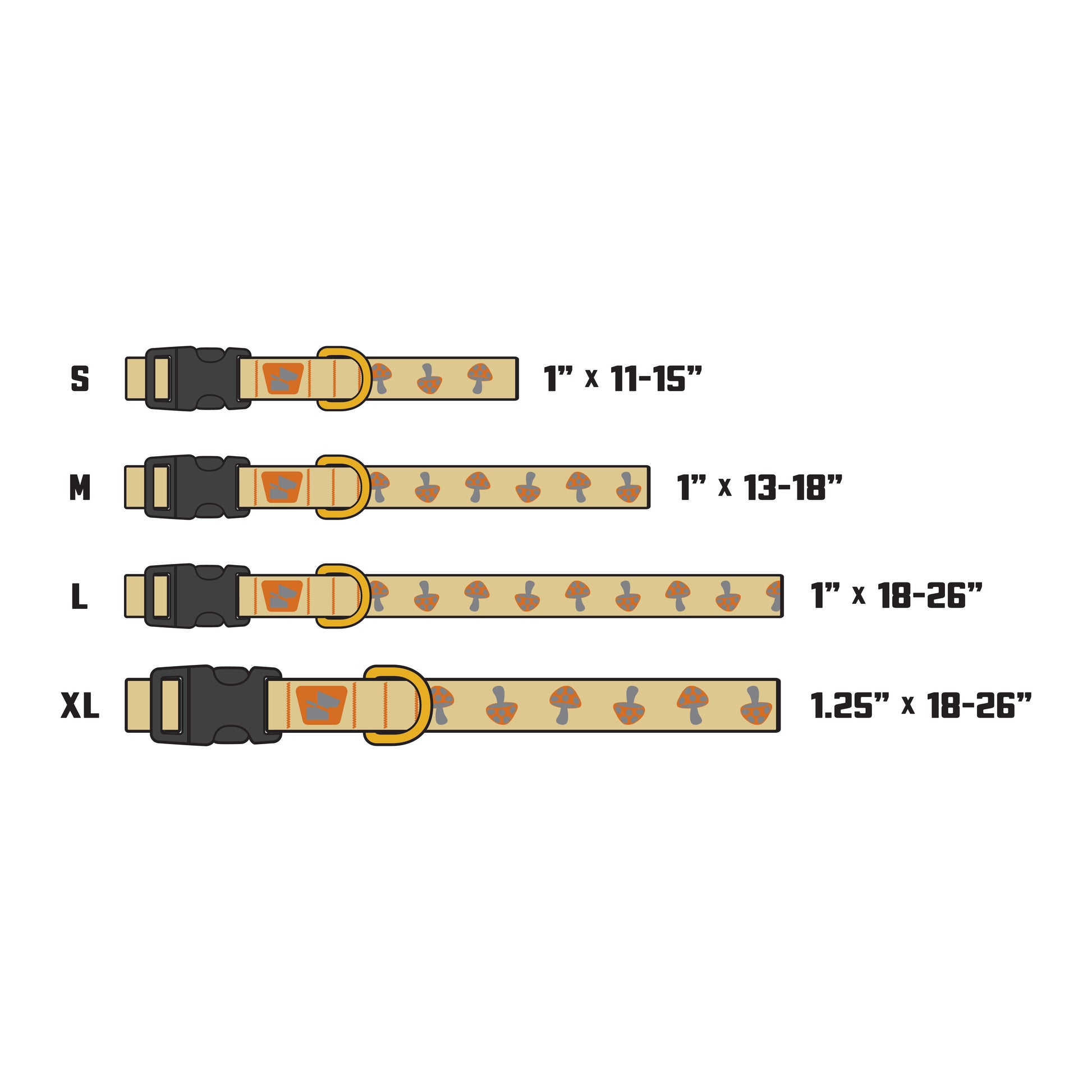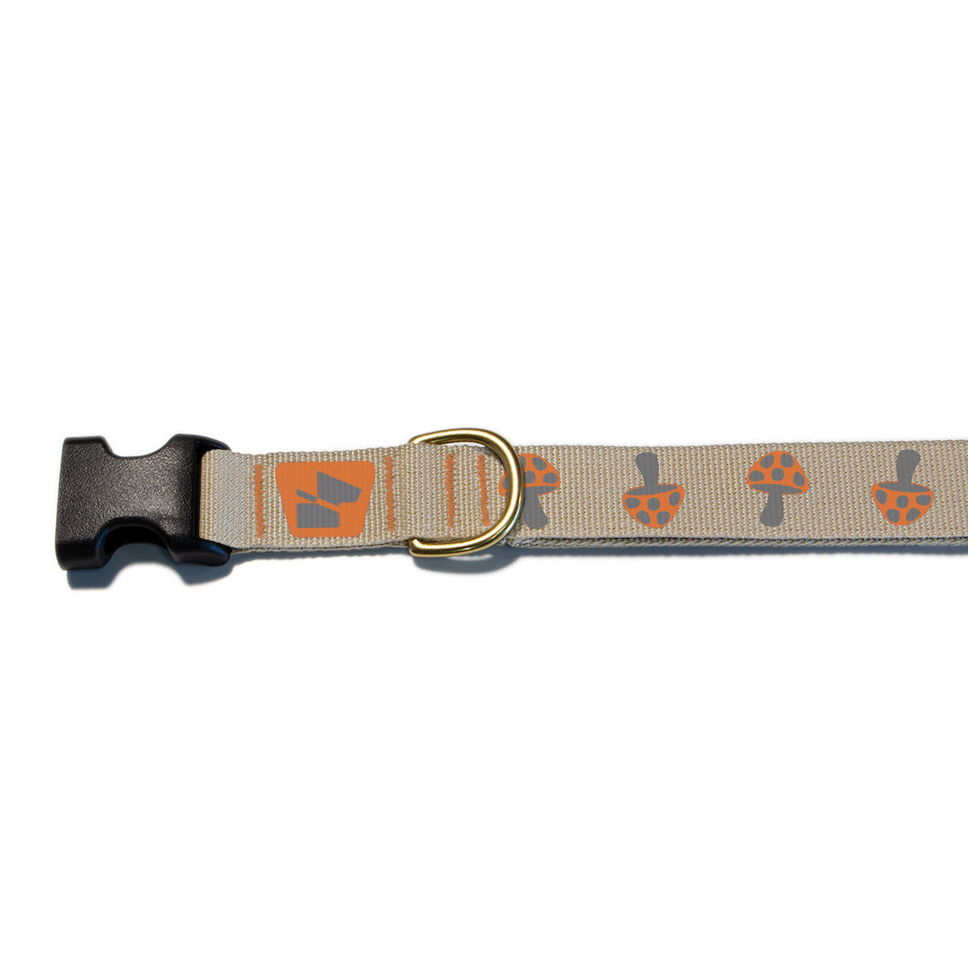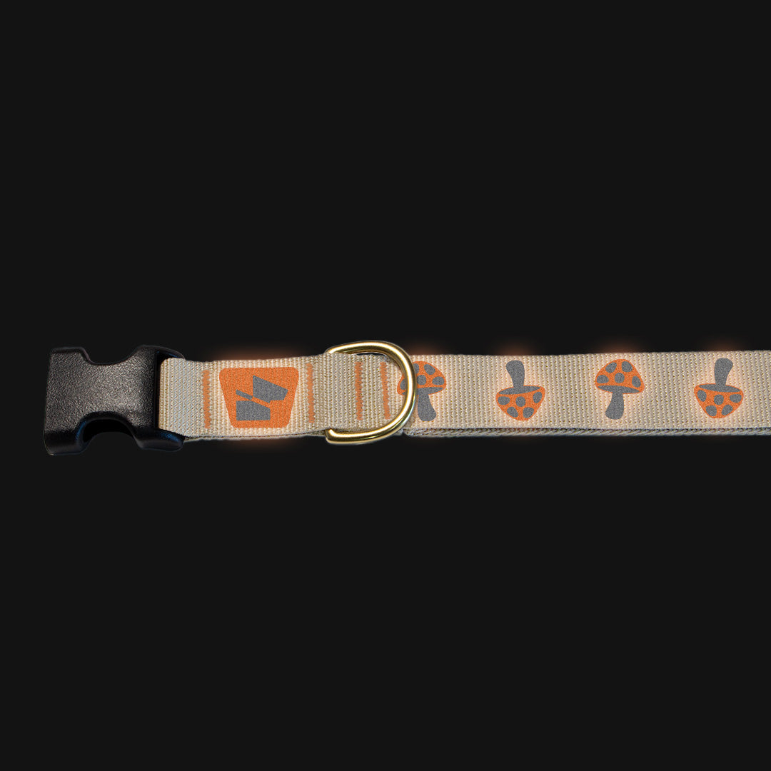 Trip into adventure with our Magic Mushrooms collar in Desert Tan. These whimsical reflective fungi create organic movement patterns that naturally draw drivers' eyes – way more effective than boring straight-line reflectors. The playful psychedelic design brings serious safety benefits while looking absolutely trippy in the best way. Built with the same technical excellence as all our Base Camp collars: mil-spec USA-made CORDURA® nylon webbing, solid brass hardware, and double-stitched construction that's ready for any journey, whether it's through city streets or forest trails.
