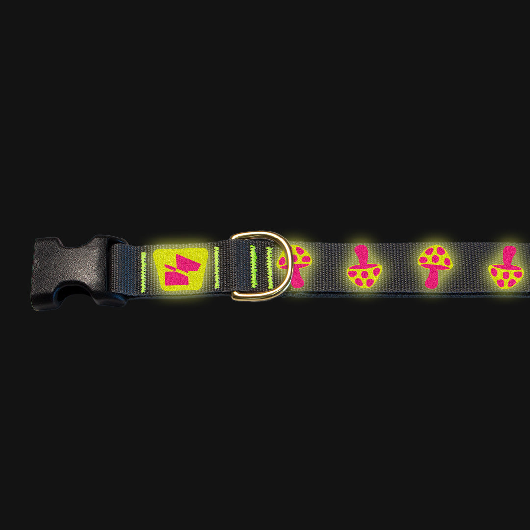 Get mystical with our Magic Mushrooms collar in Wolf Grey. These whimsical reflective fungi create organic movement patterns that naturally draw drivers' eyes – way more effective than boring straight-line reflectors. The playful psychedelic design brings serious safety benefits while looking absolutely trippy against the sleek grey base. Perfect for the pup who's got that mysterious, cool vibe but still needs to stay visible on adventures. Built with mil-spec USA-made CORDURA® nylon webbing, solid brass hardware, and double-stitched construction that's ready for any journey, whether it's through city streets or forest trails.