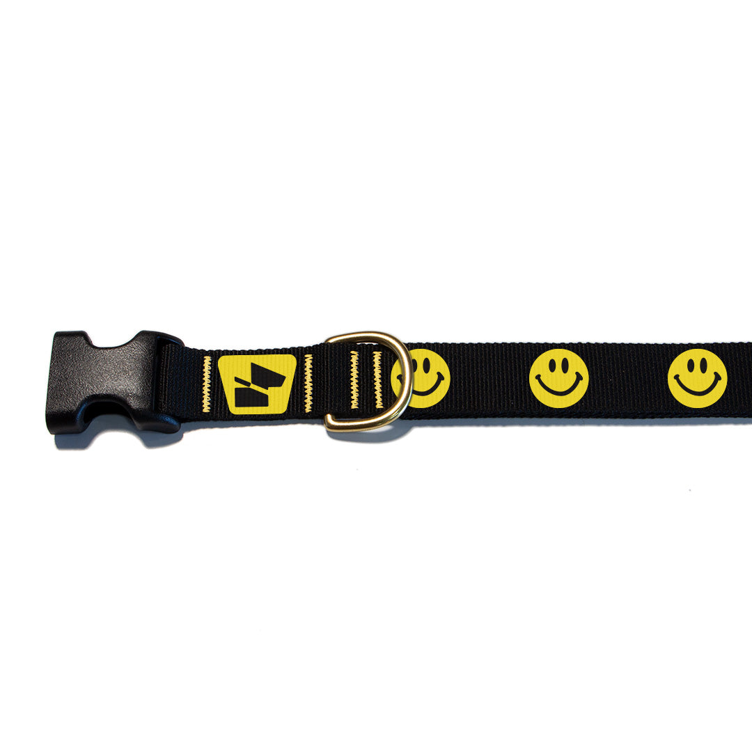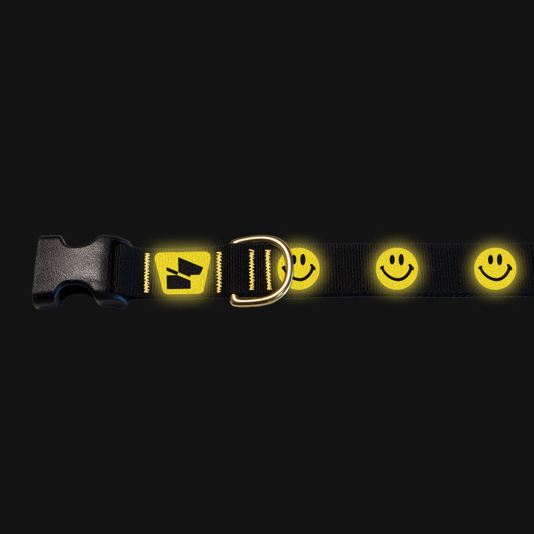 Spread good vibes and serious visibility with our Super Smilies collar in Coal Black. These aren't just happy faces – the bright yellow reflective smiley graphics create cheerful movement patterns that drivers can't help but notice. It's positivity with a purpose, turning every walk into a mood-boosting, safety-first adventure. The black and yellow combo pops in any light condition, making your pup the happiest (and most visible) dog on the block. Built with mil-spec USA-made CORDURA® nylon webbing, solid brass hardware, and double-stitched bar-tacks for durability that matches the endless energy of your adventure buddy.