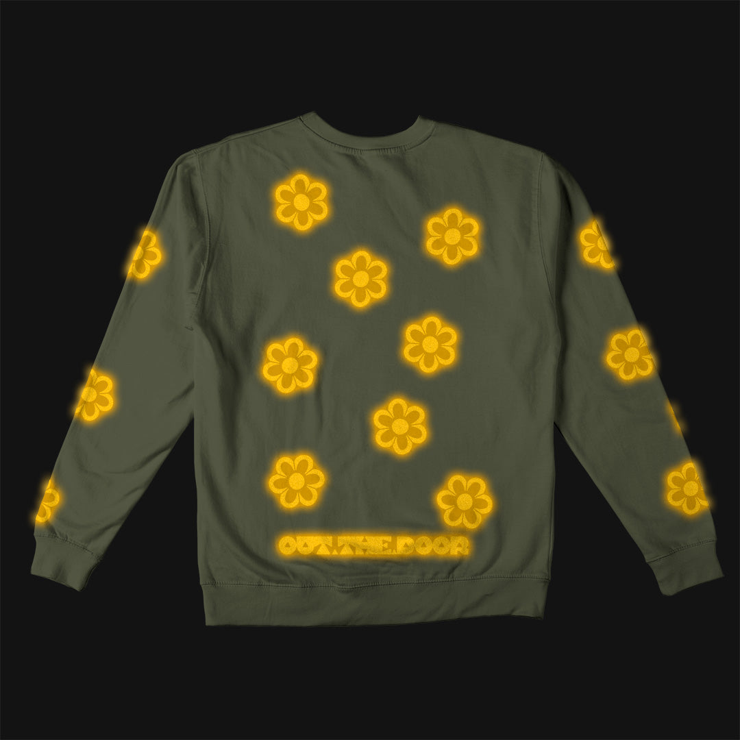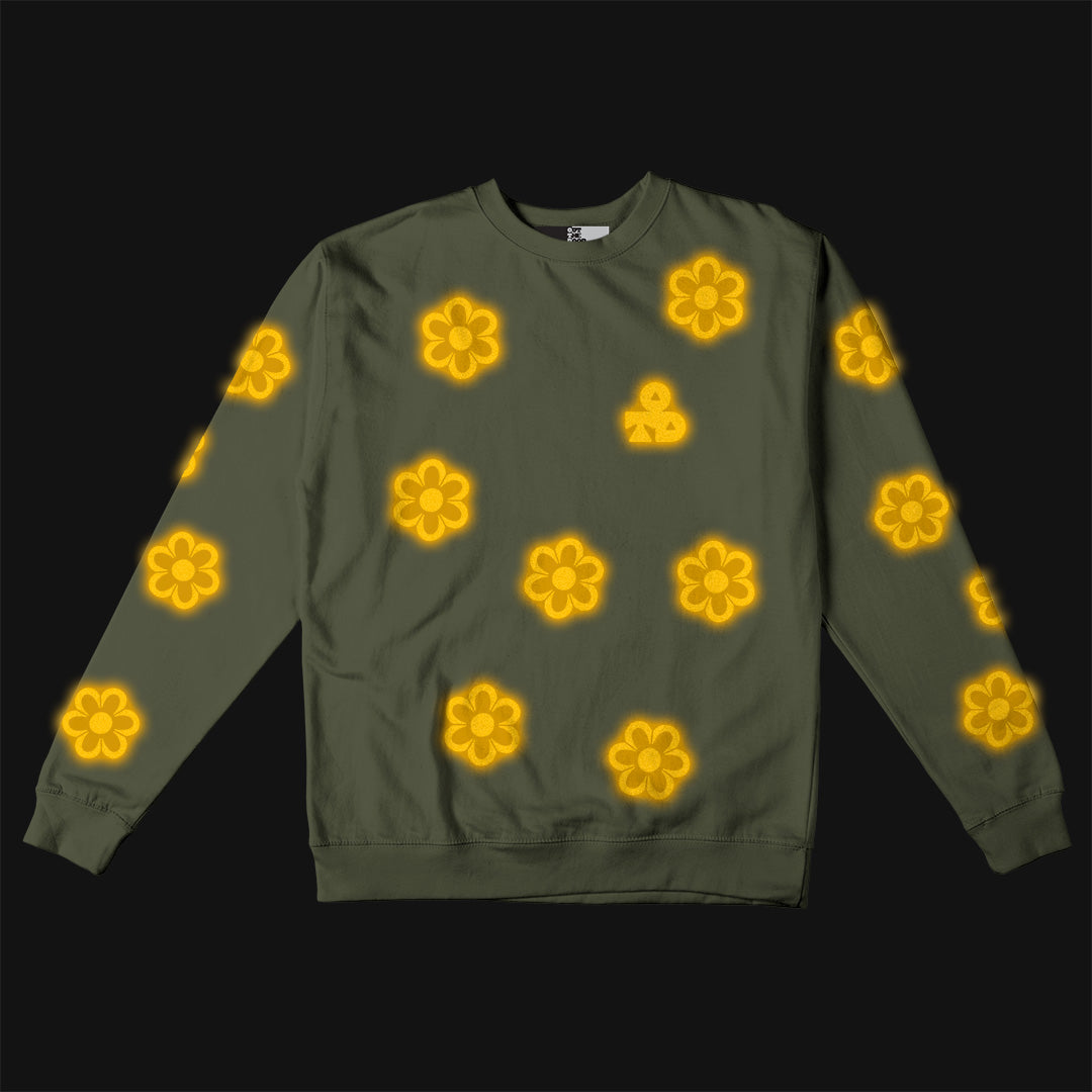 Reflective Crew Neck Sweatshirt • Funky Flowers - Dark Yellow on Army Green